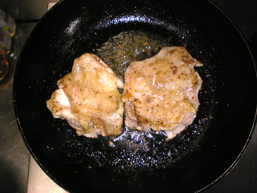 2.サラダオイルかオリーブオイルをフライパンで温め、まず中火で皮のほうをこんがり焼きます。