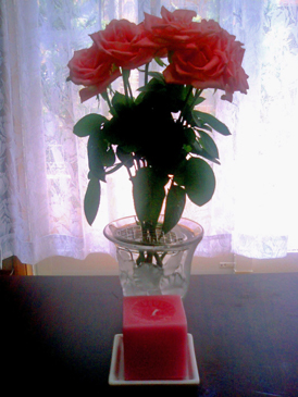 違うアングルから、写してみました。この時は、色んな偶然がかさなり、うれしくなって写してみましたが、まるで、違う表情をしているみたいで、綺麗でした、光の加減も・・・やっぱり、前に置いてあった、ばらの、アロマキャンドルも偶然で、良かったです・・・アップは、可愛い感じがして、これは、綺麗な感じがして・・・お花の表情を、楽しみながら、写したのは初めてでした。私は、お花が長持ちする液体を使いますが、やはり枯れていくのは寂しいので、買って生けると、すぐ写メをとってしまう癖がついてしまいました。まあ・・上手に生けられるのは、網のついた花瓶のおかげですが!